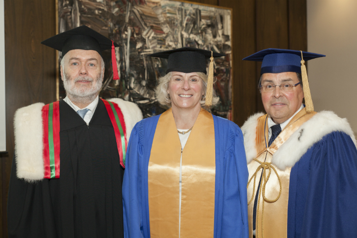 Dans l'ordre habituel, Christophe Guy, directeur général de Polytechnique Montréal, Elizabeth Cannon, récipiendaire d'un doctorat honoris causa et rectrice de l'Université de Calgary, et Guy Breton, recteur de l'Université de Montréal, lors de la collation des grades de 3e cycle de l'Université de Montréal, le 3 juin 2016.